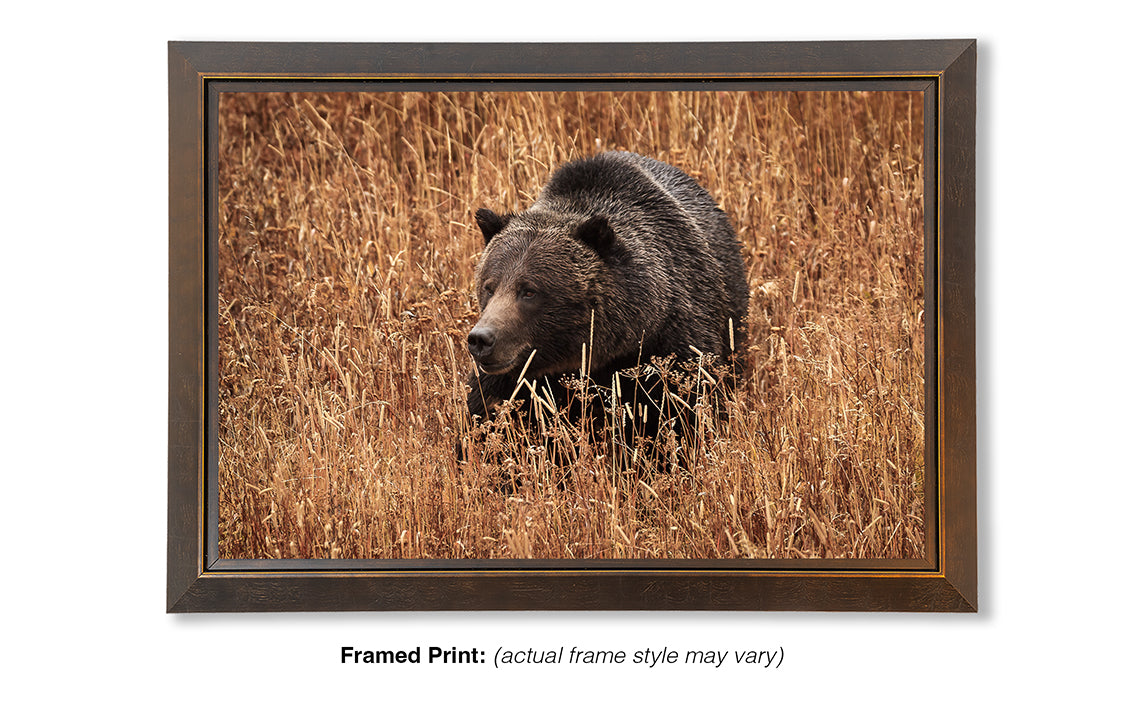 North of Jackson Lake on an early October afternoon, a grizzly bear travels through golden autumn strands of grass as it forages for food before the oncoming winter. Grand Teton National Park is home to over one hundred different species of grasses.