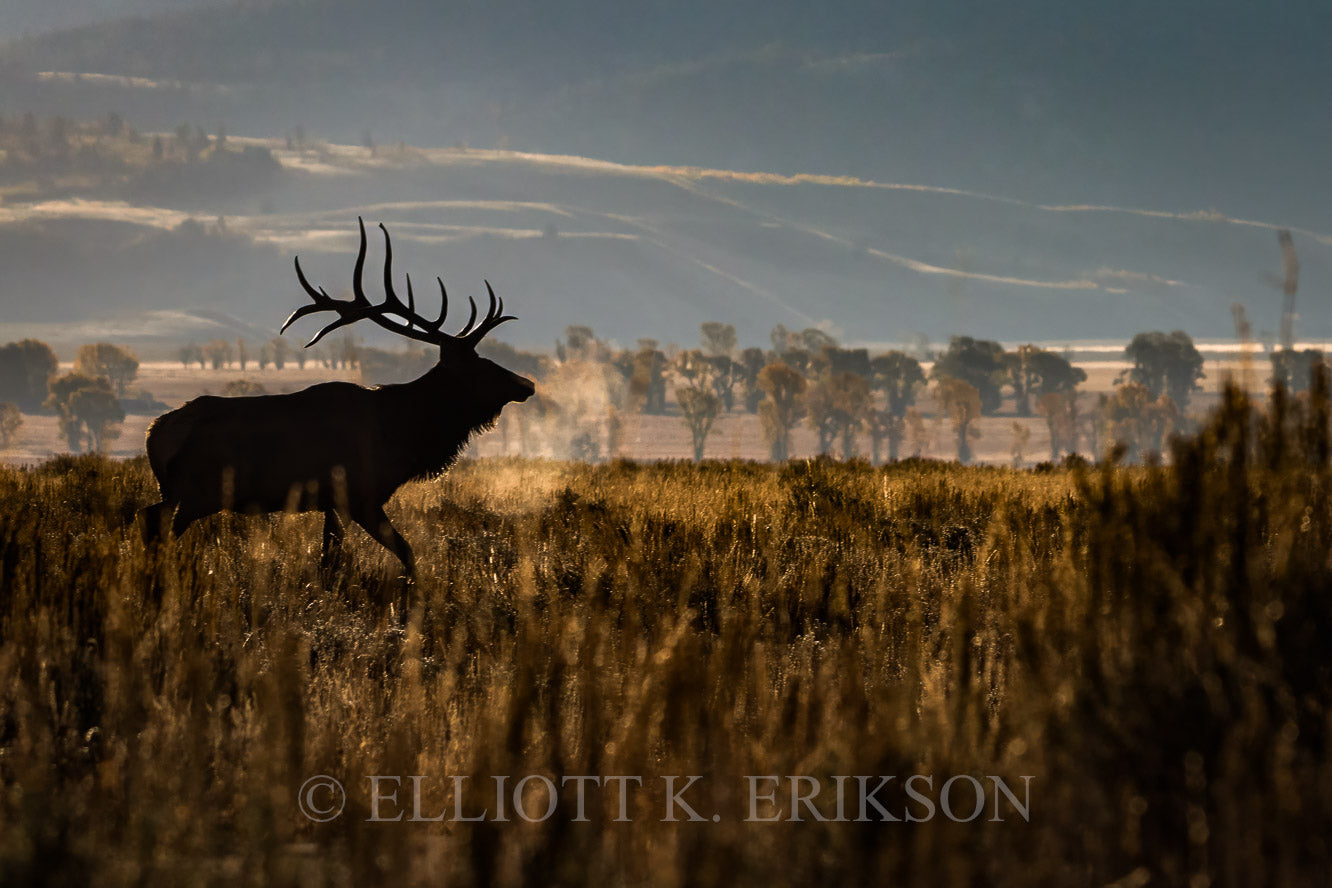 On a cold autumn morning the silhouette of a large bull elk slowly passes through the Teton valley like a ghost. Called “Wapiti” by many native cultures around the world, some Native Americans describe elk as the ghosts of the forest because of their unique ability to vanish into the woods.