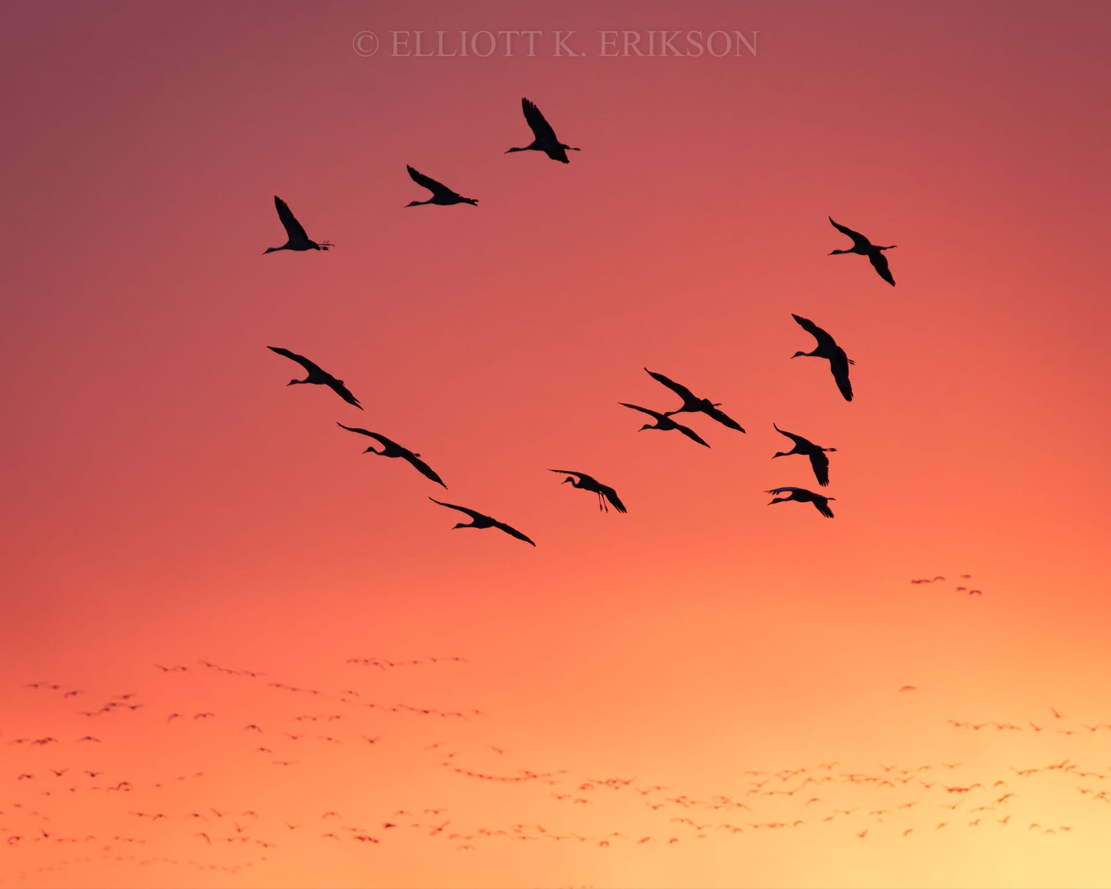 As the sun sets below the horizon thousands of sandhill cranes return in mass to the braided channels of Nebraska’s Platte River after refueling and replenishing their energy reserves in nearby farm fields and wet meadows.