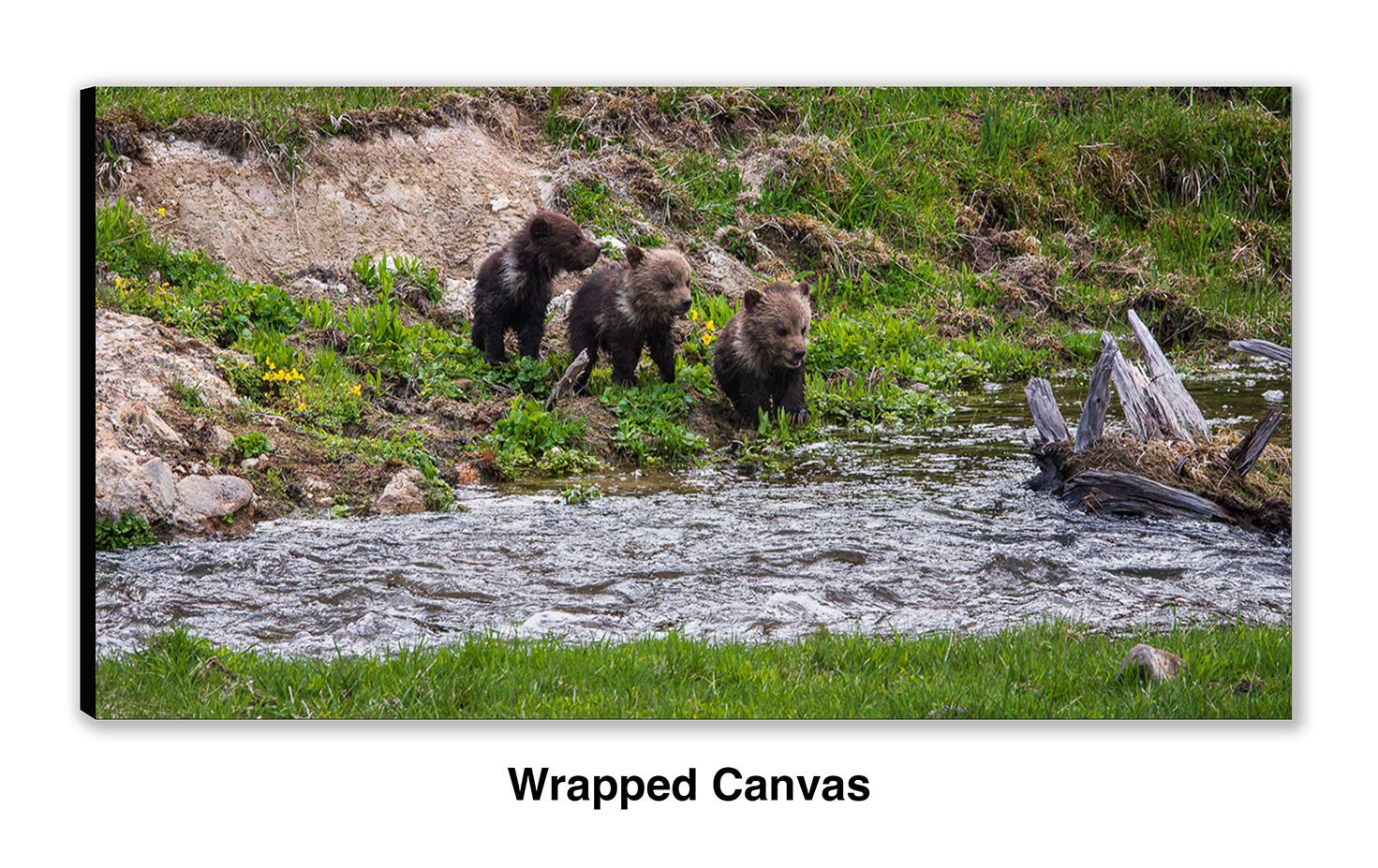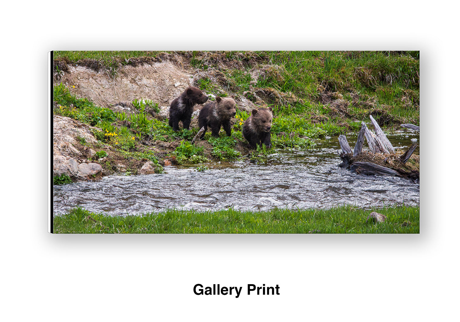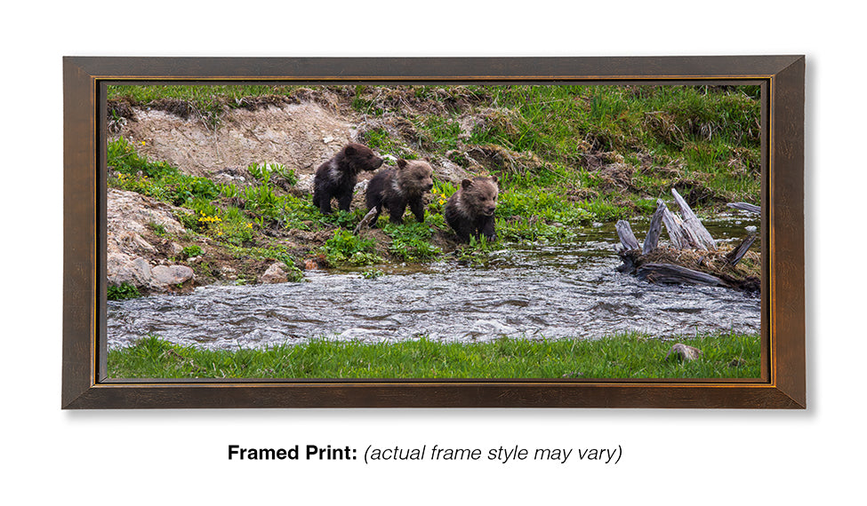 Three grizzly bear cubs of the year known as (COYs) wait along the edge of Yellowstone National Park’s Obsidian Creek for their mother to help them guide them across. Sow grizzlies with COYs are generally the last bears to leave their den in the spring. These cubs were just beginning their journey of slowly exploring their new world.